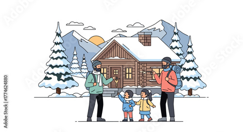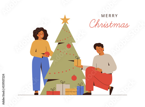 Veselé vánoční scény. Šťastný pár zdobení vánoční strom s hračkami a věnec, ploché vektorové ilustrace. Šťastný Nový Rok. Oslava zimních prázdnin.