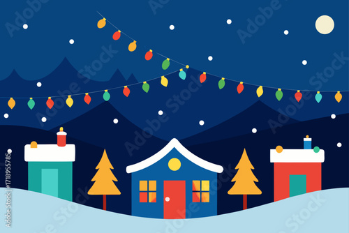 Veselé Vánoce scéna, vektorové ilustrace. Dárková krabička se stuhou a lukem na pódiu, papírové řezané zimní pozadí se siluetou jelena.