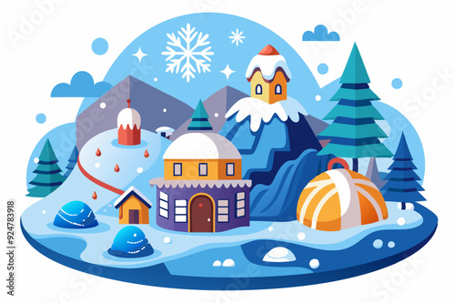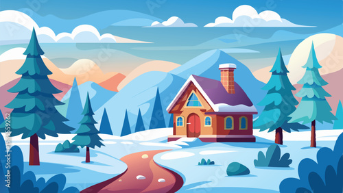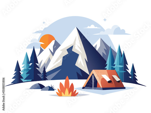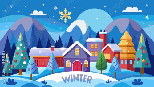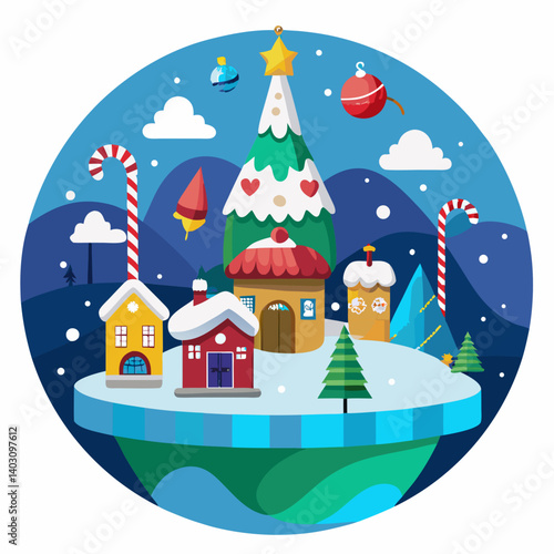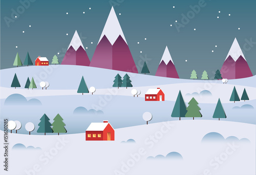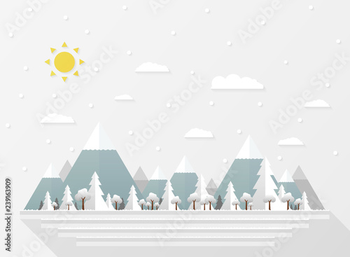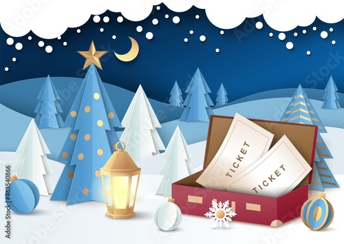 Veselé Vánoce scéna, vektorové ilustrace v papírové umění stylu. Zdobený vánoční strom s míčky, lucernou, zimní noční lesní krajinou.