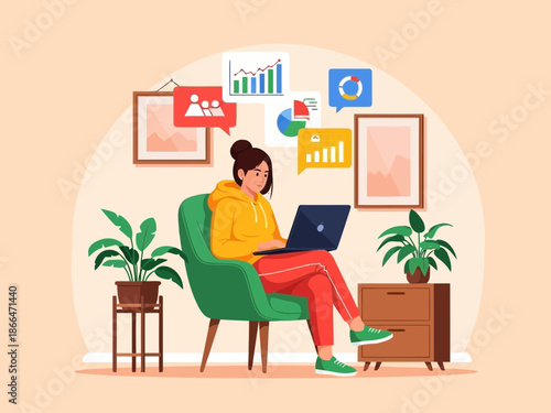 Vektorová ilustrace vědce muže sedícího u stolu s počítačovým a laboratorním vybavením. Mikroskop koncept plochý styl designový prvek.