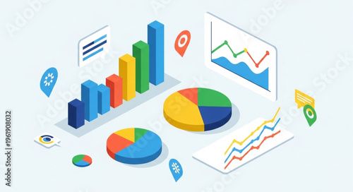 Mobile analytics concept ploché vektorové ilustrace. Izometrický smartphone s barevným výsečovým grafem a sloupcovým grafem na obrazovce. Interakce uživatelů s mobilními weby a aplikacemi.