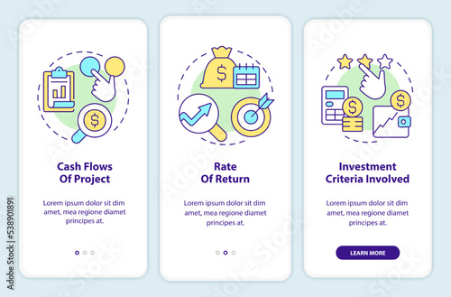 Mobilní aplikace onboarding obrazovky. Obchodní grafy a prezentace, kancelářský počítač, pracoviště, podnikatelský plán. Nabídka vektorový banner šablona pro webové stránky a mobilní vývoj. Design webových stránek plochý ilustrace.