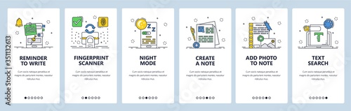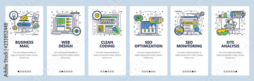 Mobilní aplikace onboarding obrazovky. Služby výpočetní techniky, antivirus, e-mail, blog, prohlížeč. Nabídka vektorový banner šablona pro webové stránky a mobilní vývoj. Design webových stránek plochý ilustrace.