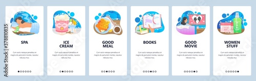 Mobilní aplikace onboarding obrazovky. Láska a pár romantické vztahy, srdce balón, dárkové předměty, svatba. Nabídka vektorový banner šablona pro webové stránky a mobilní vývoj. Design webových stránek plochý ilustrace.