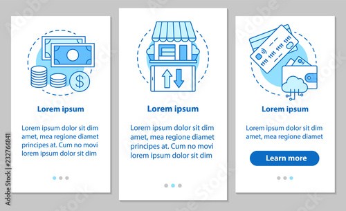 Mobilní aplikace onboarding obrazovky. Online nakupování, seo a digitální marketing, video blogování, drátový model. Nabídka vektorový banner šablona pro webové stránky a mobilní vývoj. Design webových stránek plochý ilustrace.