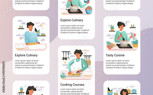 Mobilní aplikace onboarding obrazovky. Video recept, vaření jídla, šéfkuchař restaurace, menu. Nabídka vektorový banner šablona pro webové stránky a mobilní vývoj. Design webových stránek plochý ilustrace.