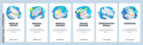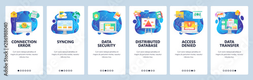 Mobilní aplikace onboarding obrazovky. Vývoj webu a kódování. Programátorka, analýza návštěvnosti webu. Nabídka vektorový banner šablona pro webové stránky a mobilní vývoj. Design webových stránek plochý ilustrace.