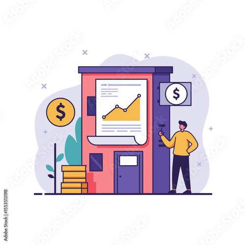 Vektorová ilustrace velkého mobilního telefonu se statistickou palubní deskou na obrazovce, žárovkou a lidmi křičícími megafonem, textovými zprávami. Používání mobilních webových stránek, mobilní aplikace pro obchodní koncept.
