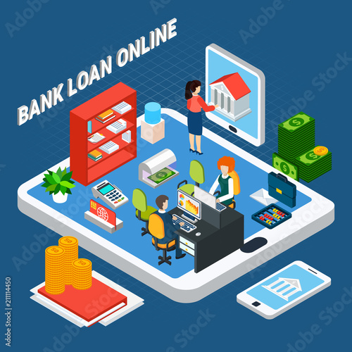 Mobilní bankovnictví vektorové ploché 3D izometrické ilustrace. Platby pomocí konceptu smartphonu.