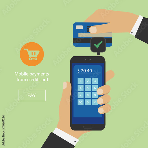 Mobilní platby pomocí smartphonu. Koncept platebního terminálu Near field communication. Online transakce, paypass a NFC. Kreslený plochý styl vektorové ilustrace.