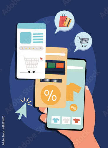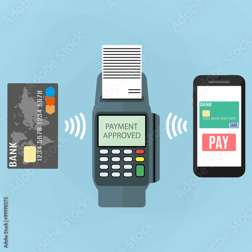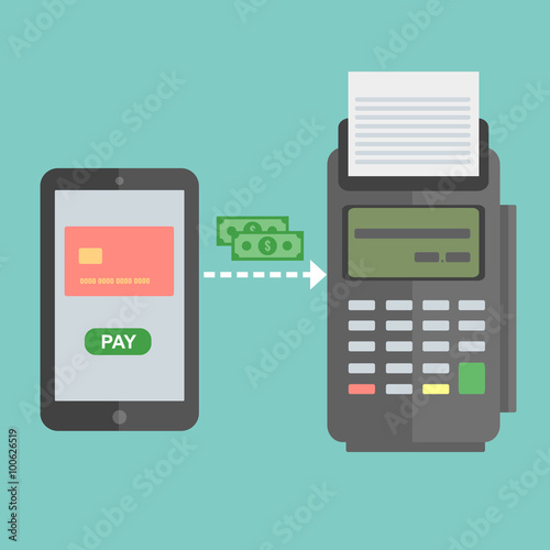 Mobilní platby pomocí smartphonu. Koncept platebního terminálu Near field communication. Online transakce, paypass a NFC. Kreslený plochý styl vektorové ilustrace.
