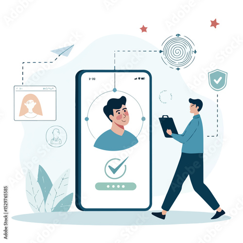 Rozpoznávání obličeje vektorové ilustrace. Mobilní telefon aplikace pro identifikaci obličeje člověka. Smartphone skenování žena hlava. Autentizační uživatelské rozhraní pro smartphone