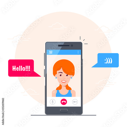 Mobilní telefon chodit s někým aplikace, dívka avatar na obrazovce, vektorová plochá ilustrace. Vztah virtuálních lidí, online chodit s někým, Virtuální Rande.