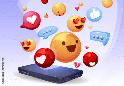 Mobilní telefon emoji koncept vektorové realistické ilustrace. Izometrický smartphone s vírem smajlíků.