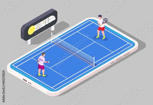 Tenis mobilní hra, ploché vektorové izometrické ilustrace. Tenisový kurt, hráči a výsledková tabule na obrazovce smartphonu. Online sportovní hra soutěž.