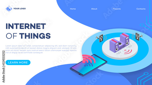 Aplikace pro cestovní banner, webová šablona. Vektorový izometrický smartphone s bazénem, palmami, plážovým křeslem a mužem na nafukovací matraci na obrazovce, kopírování prostoru, tlačítko Více informací.
