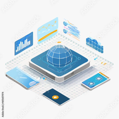 Mobilní web analytics koncept vektorové ploché izometrické ilustrace. Mobilní analytický proces monitorování a shromažďování dat prostřednictvím notebooku a smartphonu.