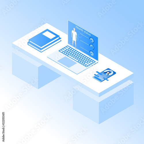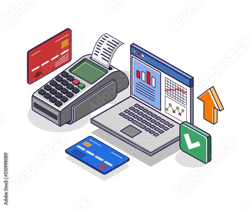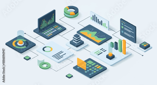 Mobilní web analytics koncept vektorové ploché izometrické ilustrace. Mobilní analytický proces monitorování a shromažďování dat prostřednictvím notebooku a smartphonu.
