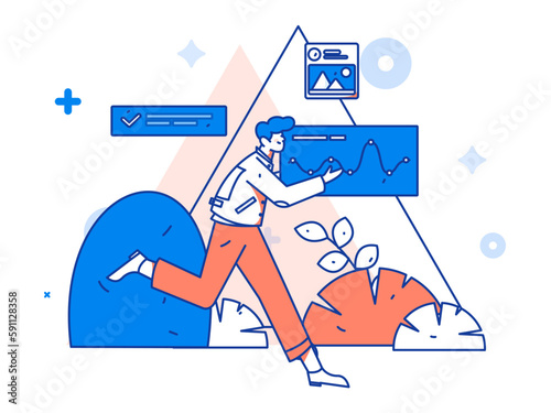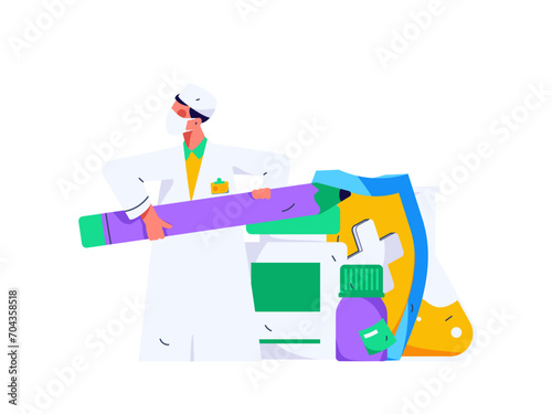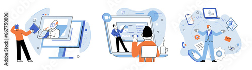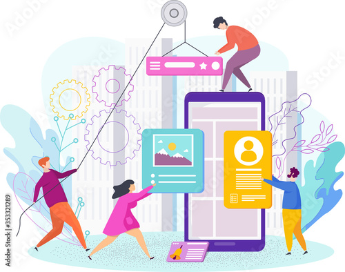Vektorová ilustrace malých postav pomocí obrovského tabletu, sluchátek a smartphonu. Moderní gadgety, koncept mobilních digitálních zařízení pro webový banner, webovou stránku atd.