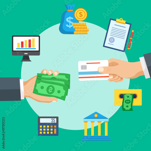 Moderní gadgets vektorové ploché ilustrace. Notebook, mobilní telefon, tablet, chytré hodinky a ruční držení dolarové mince. Elektronická zařízení, nositelná technologie, investice do moderních technologií plakát, banner.