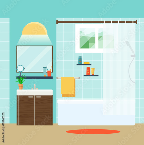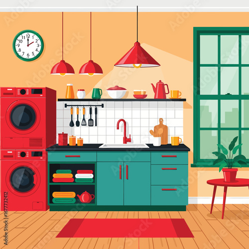 Moderní interiér kuchyně. Vektorové ilustrace v plochém stylu. Pokojový nábytek, trouba.
