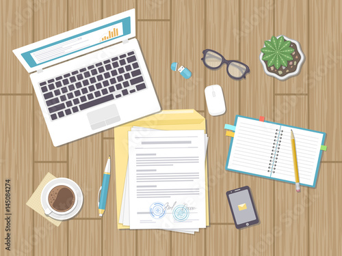 Moderní kancelář pracoviště vektorový plakát šablona. Desktop s přenosným počítačem, sluchátka, Kaktusy květiny, šálek kávy, notebook, tužky a další kancelářské potřeby, Top view flat style ilustrace.