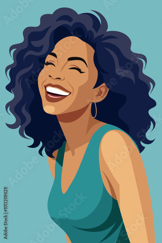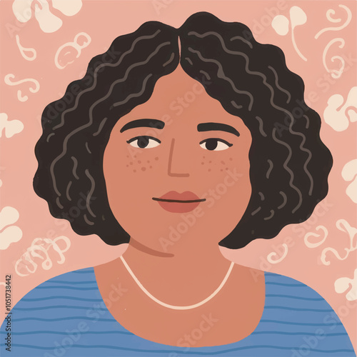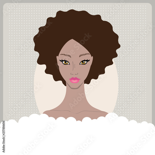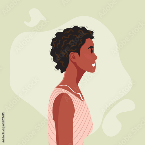 Vektorový portrét mladé hezké ženy, která se usmívá a drží v ruce bílou kabelku ve tvaru srdce. Mladá krásná dívka s tmavou pletí a tmavé vlasy s úsměvem před párty