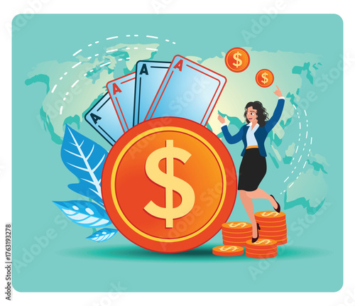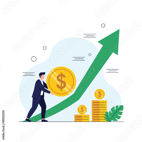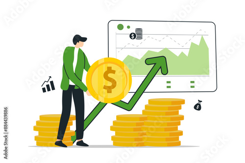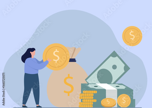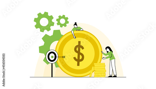 Micro mužské ženské postavy dávat peníze do obrovské tašky, vyvažování na jedné noze na dolarové mince, rostoucí šíp, velký smartphone, vektorové ploché ilustrace. Úspory peněz, digitální vklady, mobilní bankovnictví.