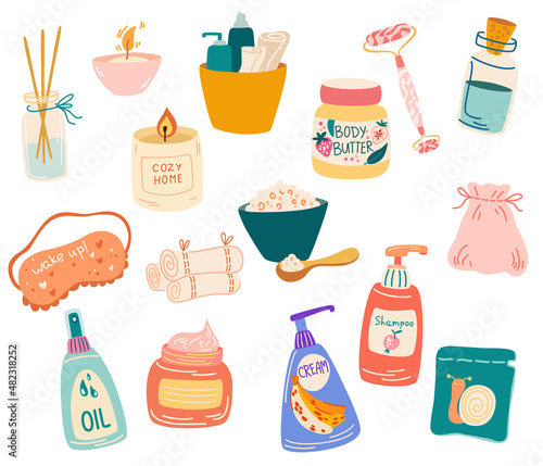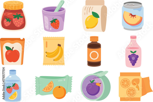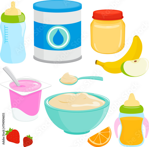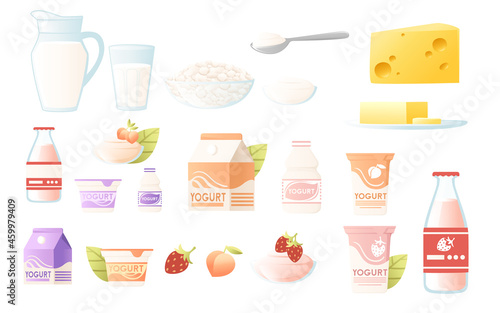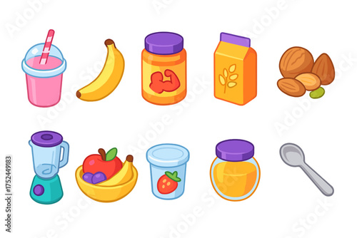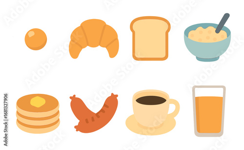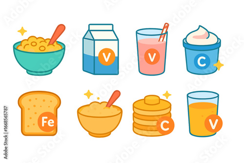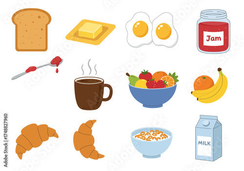 Ranní snídaně. Vektorové jídlo menu pro brunch s mlékem, káva nebo čaj nápoj, vejce se slaninou, toast a džem, sladký dezert a cereální kaše mísy ikony ilustrace izolovaných na bílém pozadí
