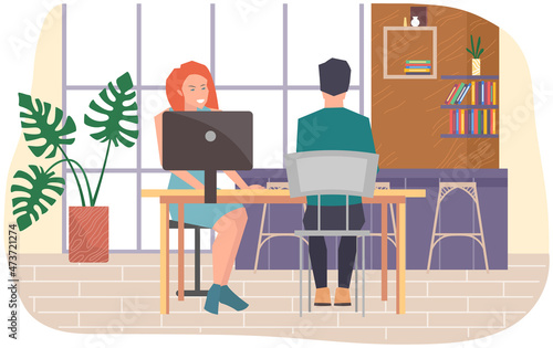 Ranní káva v kavárně koncept vektorové ilustrace. Lidé u stolu v restauraci pijí čaj. Přátelé setkání na snídani. Lidé pijí horký čaj a mluví. Žena objednává kávu u pultu.