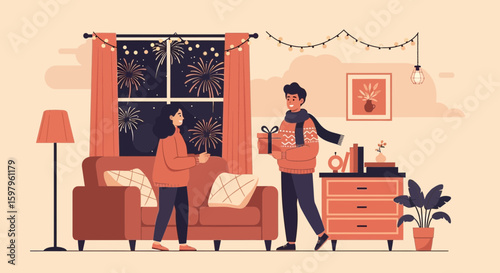 Vektorová ilustrace dospělého syna, který dává květiny své starší matce sedící v křesle u krbu. Matka koncepce designový prvek v plochém stylu.