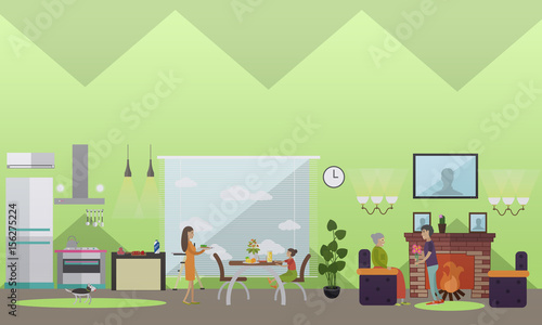 Vektorová ilustrace interiéru obývacího pokoje, mladá matka servíruje večeři, syn dává květiny své starší matce. Péče o děti, rodičovství a údržba starších rodičů plochých designových prvků.