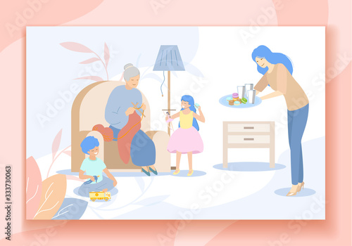 Matka meditující v pozici jógy, zlobivé děti hrající si v místnosti, ploché vektorové ilustrace. Klidná máma se zlomyslnými dětmi. Rodičovský stres, rodičovství.