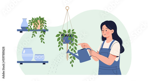 Matka s novorozeným dítětem plochý vektor. Máma drží novorozené dítě a zalévání domů květina ilustrace. Mateřství, mateřství a šťastná rodinná každodenní rutina