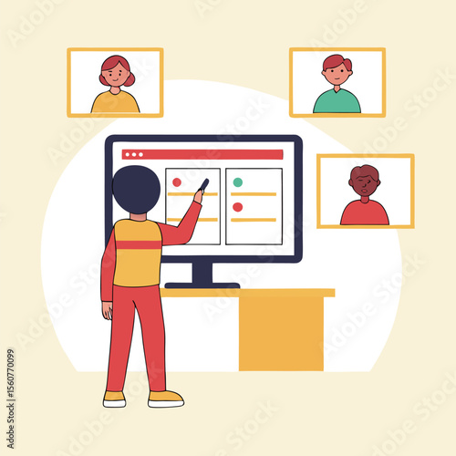 Motion designer animator pracuje na počítači a vytváří animované video, zatímco sedí u stolu, vektorové ploché izometrické ilustrace. Koncept služeb pohybového grafického studia pro webový banner, webovou stránku atd.