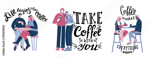 Káva cituje ručně kreslené nápisy typografie s šťastné páry mají kávu v dopoledních hodinách, vektorové ploché ilustrace izolovaných na bílém pozadí. Motivační kávové výroky.