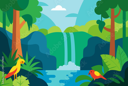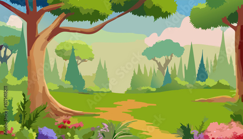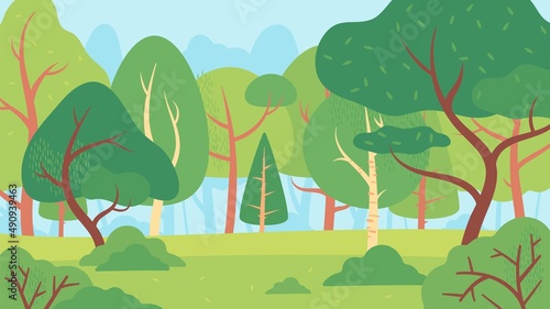 Horský les kreslený Příroda vektorové pozadí. Zelené louky louka se stromy a keři. Krásná krajina ilustrace
