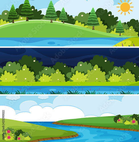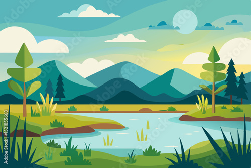 Mountain lake view vektorové ilustrace. Krásná příroda pozadí. Letní krajina. Malebné údolí panorama s řekou v pastvinách