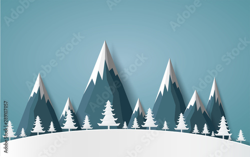 Horolezectví web banner, plakát šablony, vektorové ilustrace v papírové umění řemesla stylu. Horolezec stojící vedle vlajky na vrcholu hory. Extrémní zimní sporty. Horolezectví, zimní turistika.