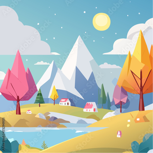 Hory s lanovkou, lesem, lodí, stanem na břehu řeky, vektorové ilustrace v papírovém uměleckém stylu. Horský kemp, šablona plakátu letního kempu.