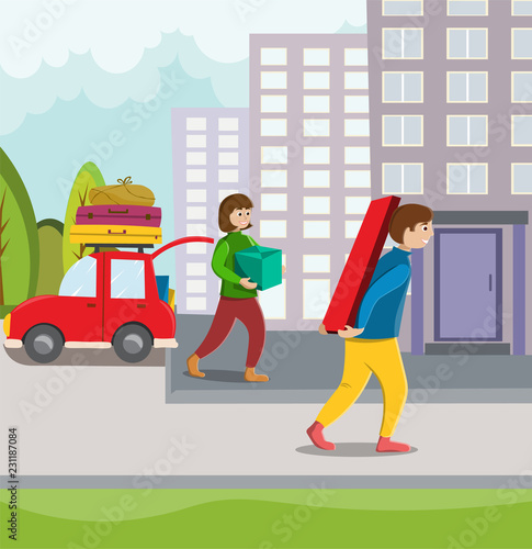 Stěhováci nakládání pohybující se kamion s kartonovými krabicemi, nesoucí pohovka, ploché vektorové ilustrace. Lidé se stěhují do nového domova. Služby přemístění společnosti.