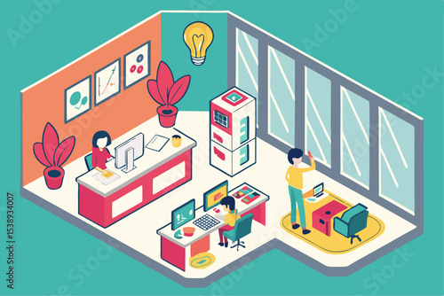 Budova kina v izometrickém stylu. Vektorové ploché 3D ikony. Interiér kina, kavárny, pokladny.