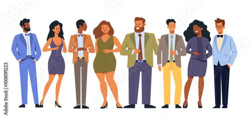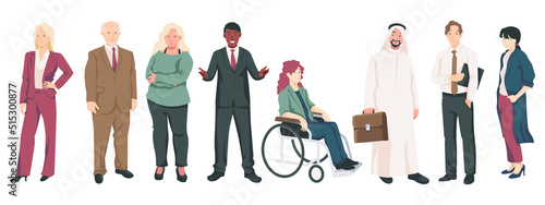 Nadnárodní obchodní tým, koncept vektorové ilustrace. Různorodá skupina lidí, mužů a žen různých etnických a věkových skupin v kancelářských oblecích. Znaky izolované na bílém.