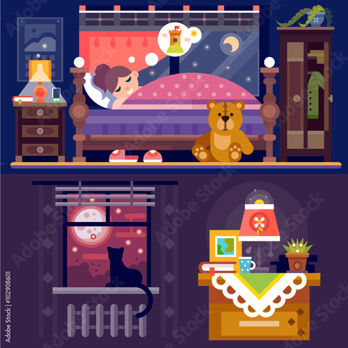 Vícepodlažní bytový dům s hlučnými sousedy žijícími v něm, ploché vektorové ilustrace. Skupina lidí tančí, pár křičí, muž vrtá zeď, pes štěká u vchodových dveří, děti si hrají.
