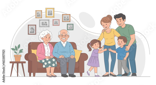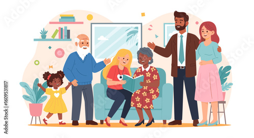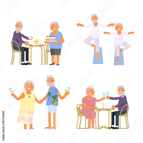 Šťastné mladé a starší páry sledují hudební koncert online doma z přenosných počítačů, vektorové ploché ilustrace. Live streaming virtuální koncert.