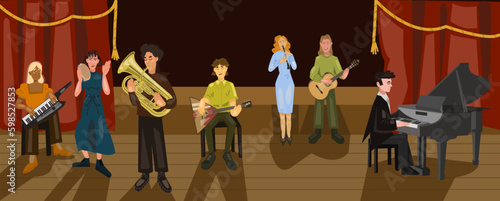 Hudební kapela vystupující na jevišti punk rockového festivalu vektorové ilustrace. Hudebník rock-and-roll umělec hraje hudbu zpěv píseň před šílenství nadšené lidi publikum