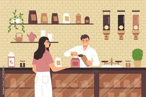 Šťastný muslimský rodinný pár v obchodě s parfémy, ploché vektorové ilustrace. Saúdskoarabský muž a žena v tradičním arabském oblečení s nákupními taškami. Parfumerie, interiér obchodního domu.