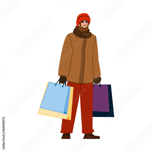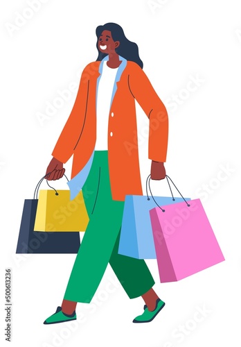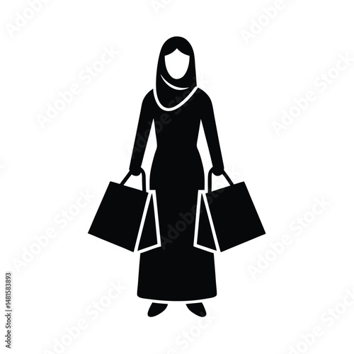 Muslimská žena nesoucí nákupní tašky vektorové ikony izolovaných na bílém pozadí.