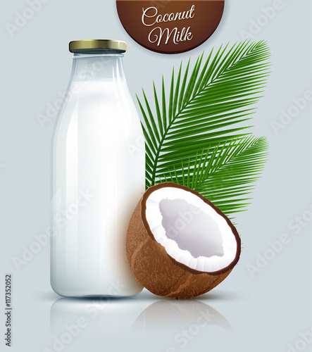 Kokosový olej vektorové ilustrace. Realistické složení olejové láhve s kokosem celé, poloviční, kusové, palmové listy. Organický přírodní produkt používaný pro potraviny, pro péči o vlasy a pokožku.