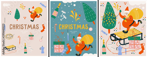 Nový rok 2021 blahopřání šablony. Vektorová sada ilustrací zimní dovolené ve vintage stylu. Vánoční strom a hračky. Nový rok ručně kreslený plakát v zápisníku nebo koláž stylu.